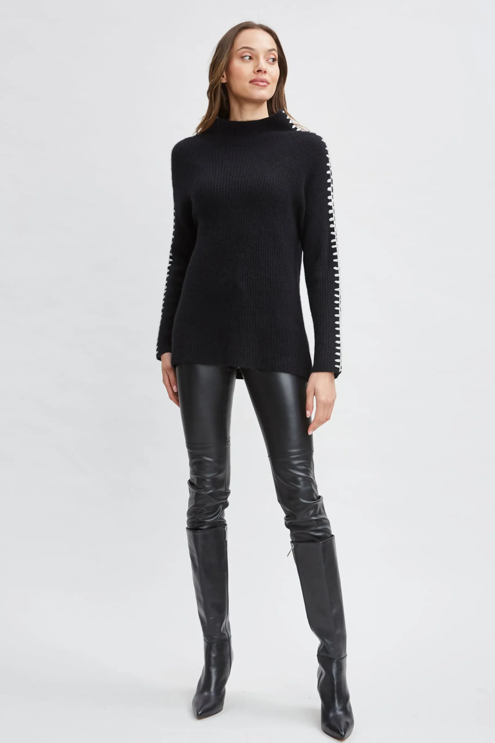 Graphic whip stitching from the funnel neck to the cuff details our relaxed fit sweater. Perfect for when the temperature drops, you will love the soft hand feel of this ultra-soft Cashmere yarn. Long Sleeve Cashmere Sweater with a Relaxed Fit u0026amp; Stitching Detail 100% Cashmere Runs true to size Model is 5’9″ and wearing size S Dry Clean Only Imported Style #: ETR34198
