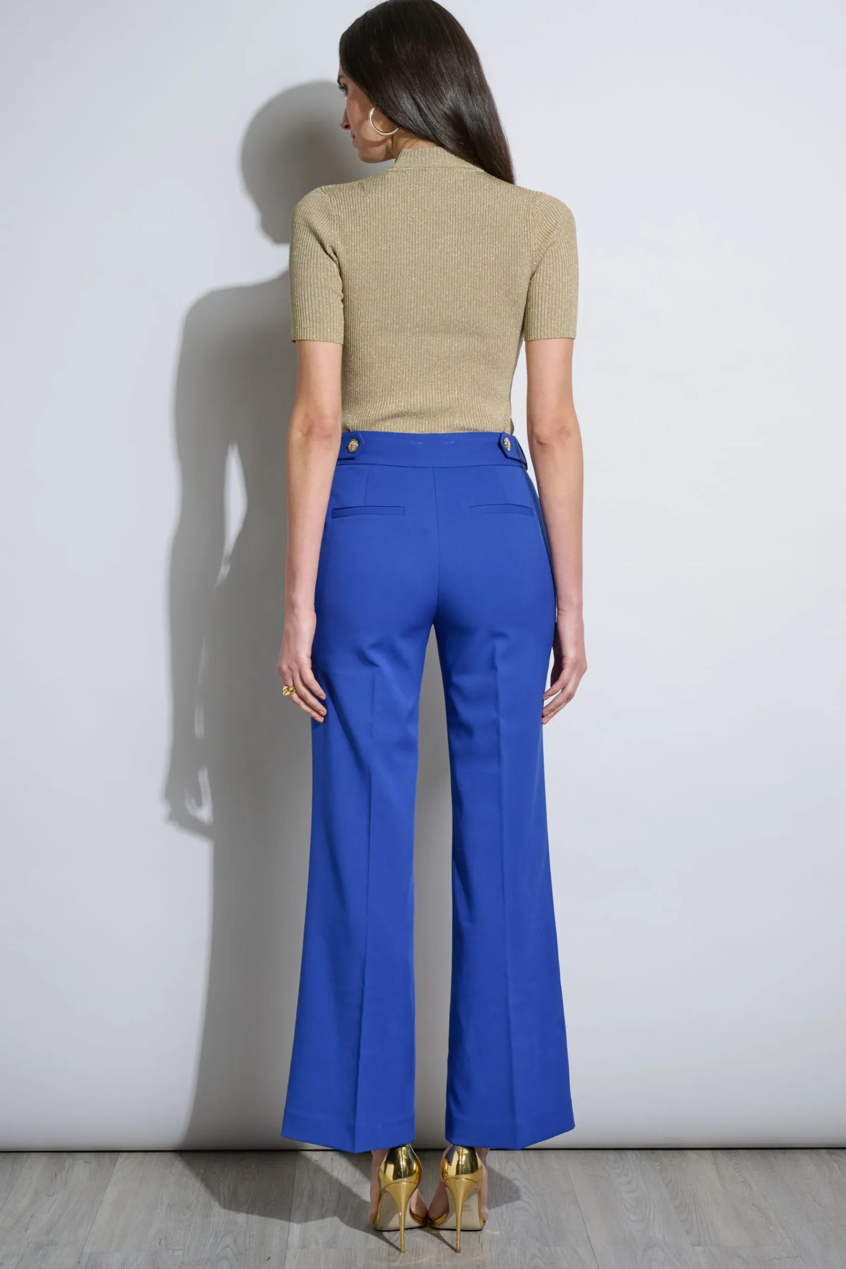 Our fit u0026amp; flare pants have a modern twist with graphic crest buttons at the waist. In our iconic crepe, these pants feature pintuck detailing u0026amp; side pockets – perfect for work or dinner. Crepe Crest Button Fit u0026amp; Flare PinTuck Pant 88% Polyester, 12% Elastane Runs true to size. Model is 5’9″ and wearing size 2 Measurements: Inseam 31.5″L, Front Rise 11.75″L (approx. length for size 6) Machine Wash Imported Style #: ETR34123
