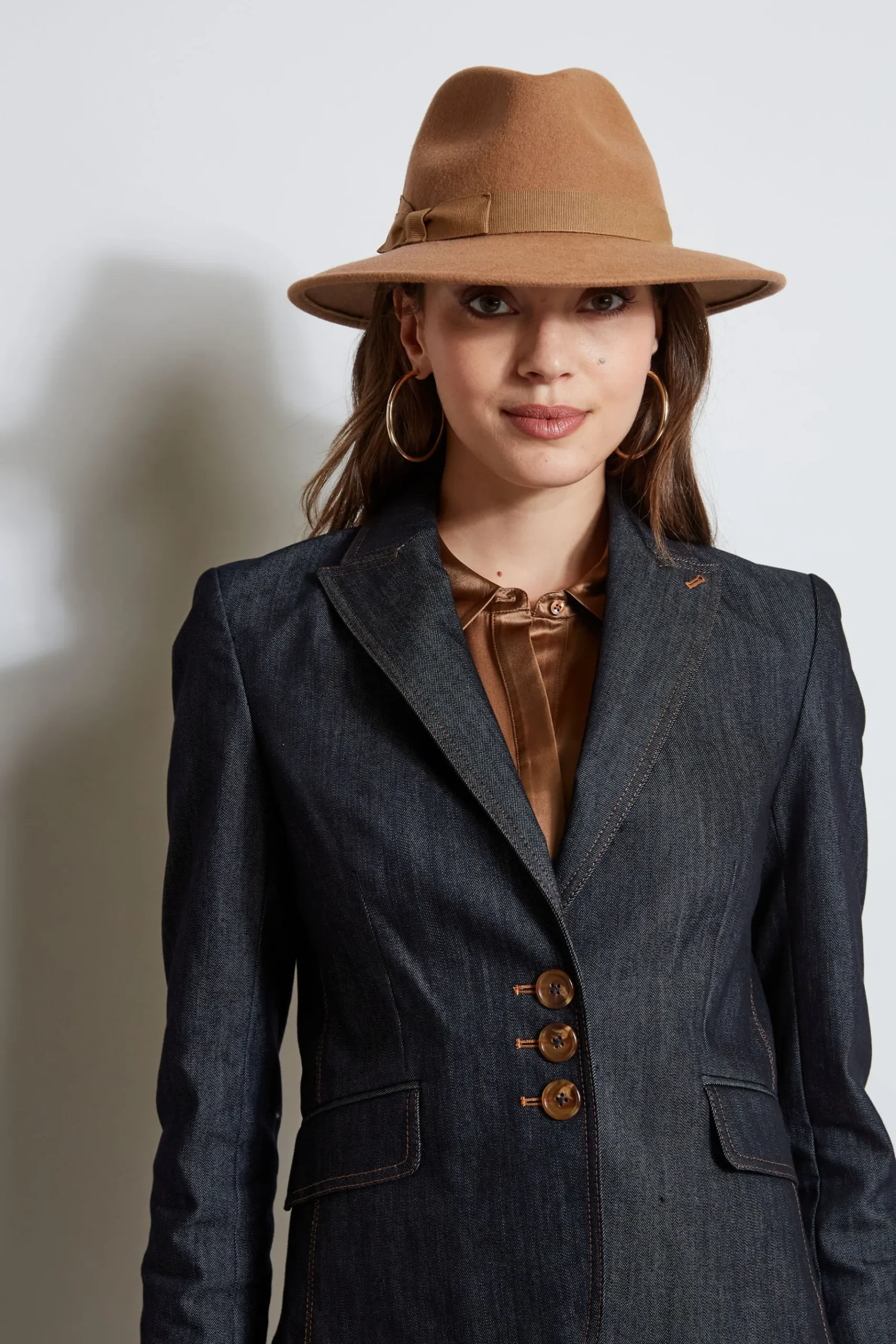 With modern lean lines and sharp tailoring, the denim blazer is an essential in your fall wardrobe rotation. Done in luxe stretch denim, single breasted with peaked lapels, contrast caramel stitching and an impeccable cut, it has the cool factor you are looking for in your new favorite blazer. Pair it with its matching pant or wear it as a separate. Three-Button, Mid-Length Denim Blazer 74% Cotton, 24% Polyester, 2% Elastane Runs true to size. Model is 5’9″ and wearing size 2 Length From Shoulder to Hem: Back 22.25″L, Sleeve 24.5″L (approx. length for size 6) Dry Clean Only Imported Style #: ED02P103