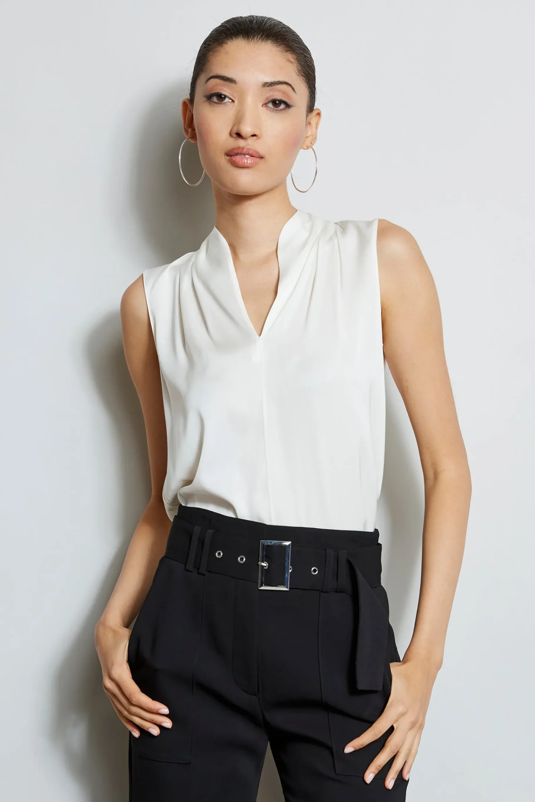 Luxurious Silk Georgette elevates this minimalist top. With its contour neckline and soft shoulder pleat detail, this essential piece will take you from Summer into Fall. Sleeveless, pleated shoulder top with stand collar and split neckline 95% Silk, 5% Elastane Relaxed Fit; Runs true to size Model is 5’9″ and wearing a size S Length From Shoulder to Hem: Front 26.25″L; Back 30″L (approx. length for size S) Dry Clean Only Imported Style #: EU8RM50U