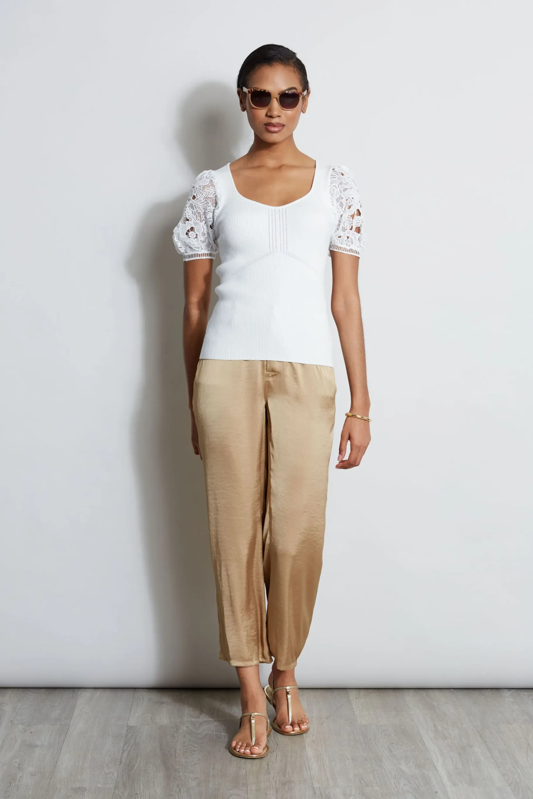 By mixing luxe Viscose with romantic openwork lace sleeves, this sweater is instantly transformed into something special. Modern and femme, it features contour neckline u0026amp; body skimming silhouette. Dress it up or down with our favorite denim jean. Contour Neck Viscose Blend Sweater with Openwork Lace Sleeves 72% Viscose, 28% polyester Runs true to Size Model is 5’9″ and wearing size S Measurements: 22.5″ from shoulder to hem (approx. measurement for size Small) Dry Clean Only Imported Style #: ETR41326