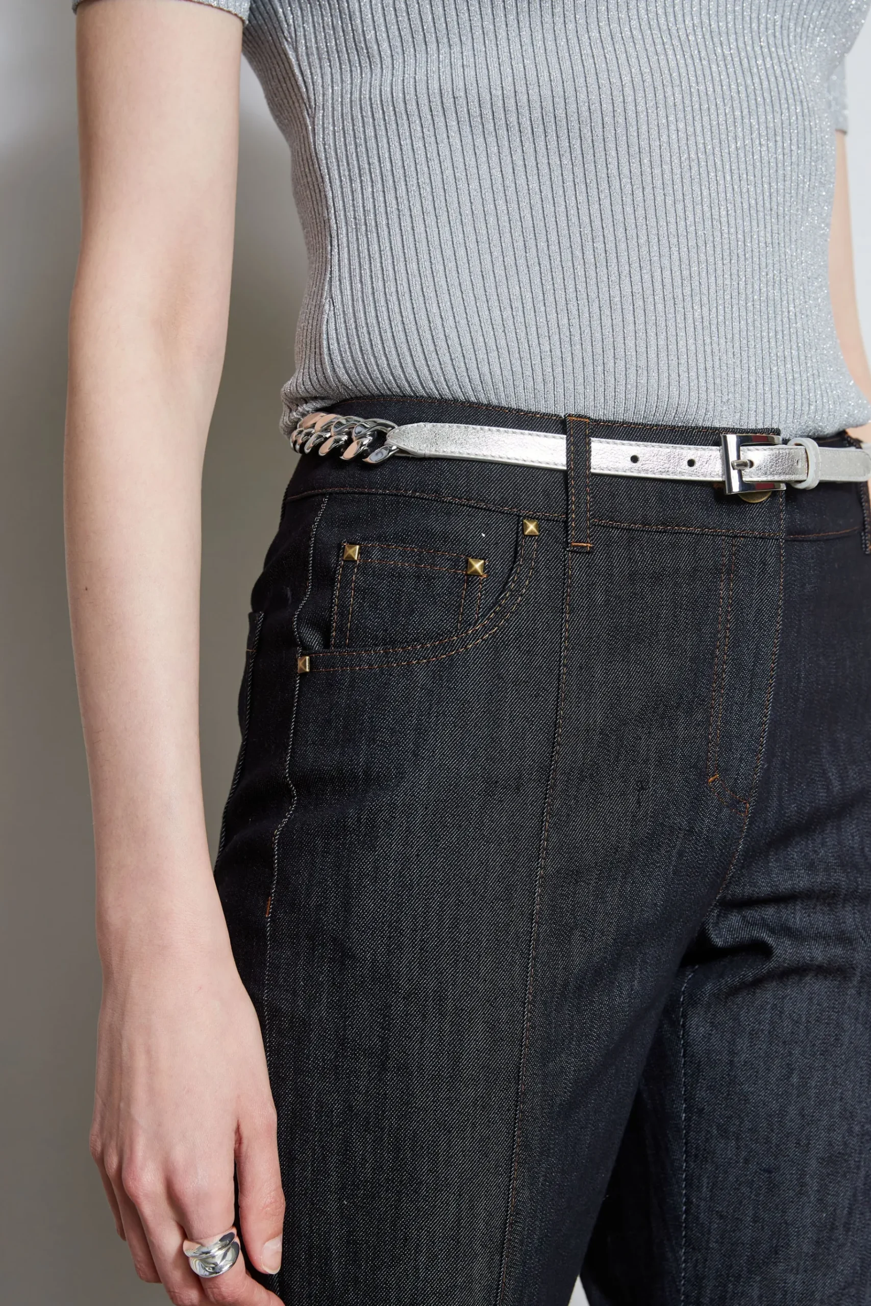 The “IT” accessory for Spring. Add an effortless glam factor to any look with our Silver Chain link belt. We love it worn with a suit or dress – style meets function with the must-have belt of the season. Wear it buckled in the back for an all chain look, or wear it buckled in the front highlighting its modern leather tab closure and silver buckle. Brass Chain Metallic Leather Belt 100% Leather, Silver Made in Italy A815G003