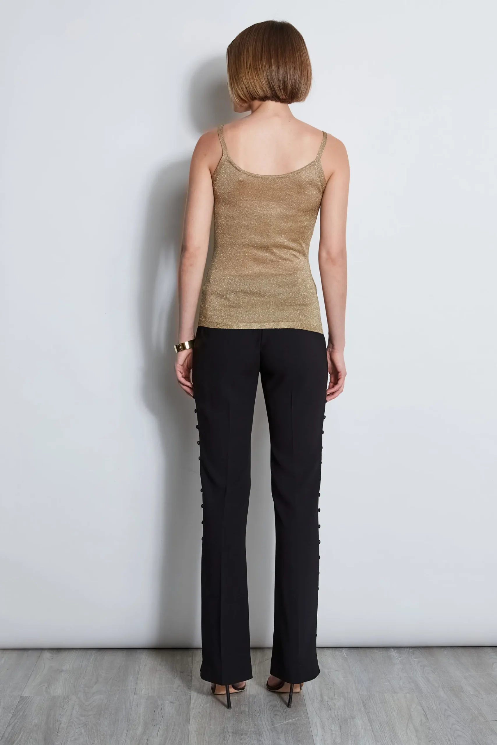 Nothing beats the chic factor and luxe patina of our metallic knit Cami. Detailed with a soft cowl neckline, our Metallic Cowl Tank is perfect for channeling a glam vibe. Wear it layered under a Blazer or on its own for a modern femme vibe. Elie Tahari Exclusive Metallic Knit Draped Cowl Neck Tank Top 80% Acetate, 10% Metal, 10% Polyamide Runs true to size. Model is 5’9″ and wearing size S Dry clean Imported Style #: E7518504