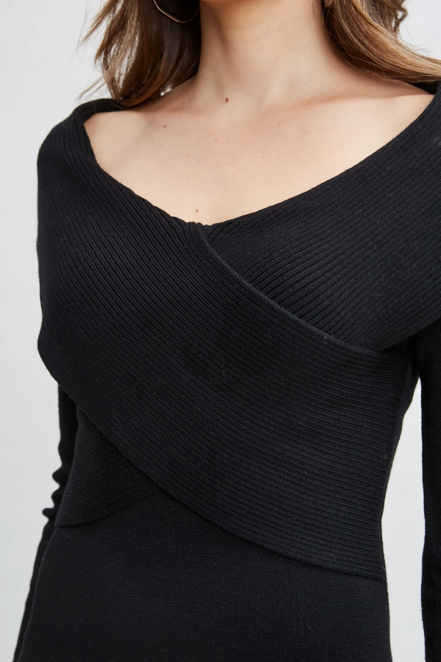 Cool u0026amp; unique, our off-shoulder sweater dress is a must-have in your wardrobe. Designed in luxe Merino Wool, the edgy rib knit crossover silhouette makes this dress unique. Long Sleeve Wrap Bodice Wool Sweater Dress 100% Merino Wool Runs true to Size Model is 5’9″ and wearing size S Dry Clean Only Imported Style #: ETR44260