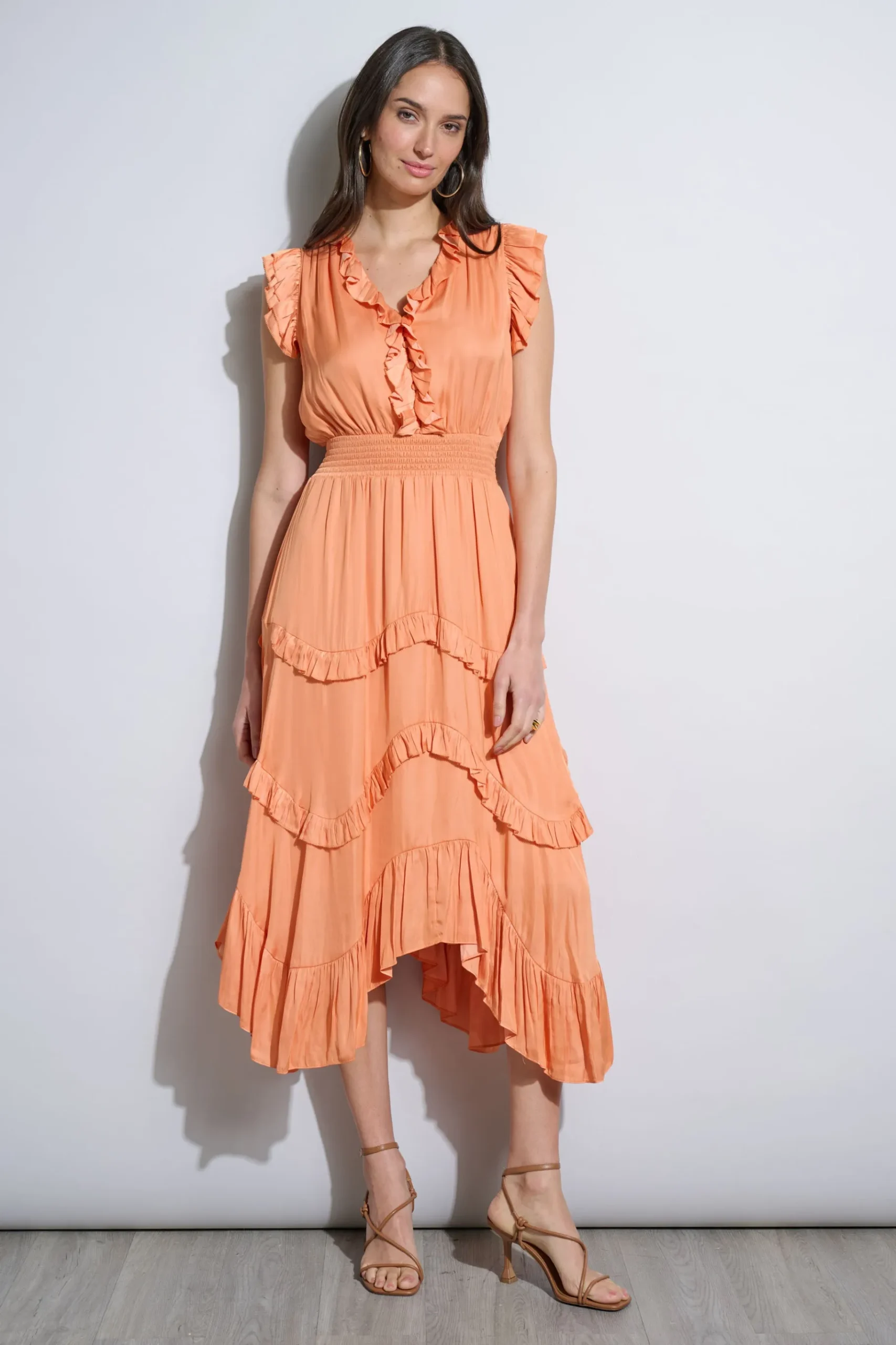 It’s all in the details. Romantic u0026amp; feminine, our midi dress features ruffle detailing throughout u0026amp; a smocked waist. With its soft flutter sleeves, v-neckline u0026amp; asymmetric hem, this style is an effortless one u0026amp; done. V-Neck Midi Dress with Smocking u0026amp; Ruffle Details 100% Polyester Runs true to Size Model is 5’9″ and wearing size S Measurements Shoulder to Hem: 55″L (approx. length for a size S) Dry Clean Only Imported Style #: ETR31259