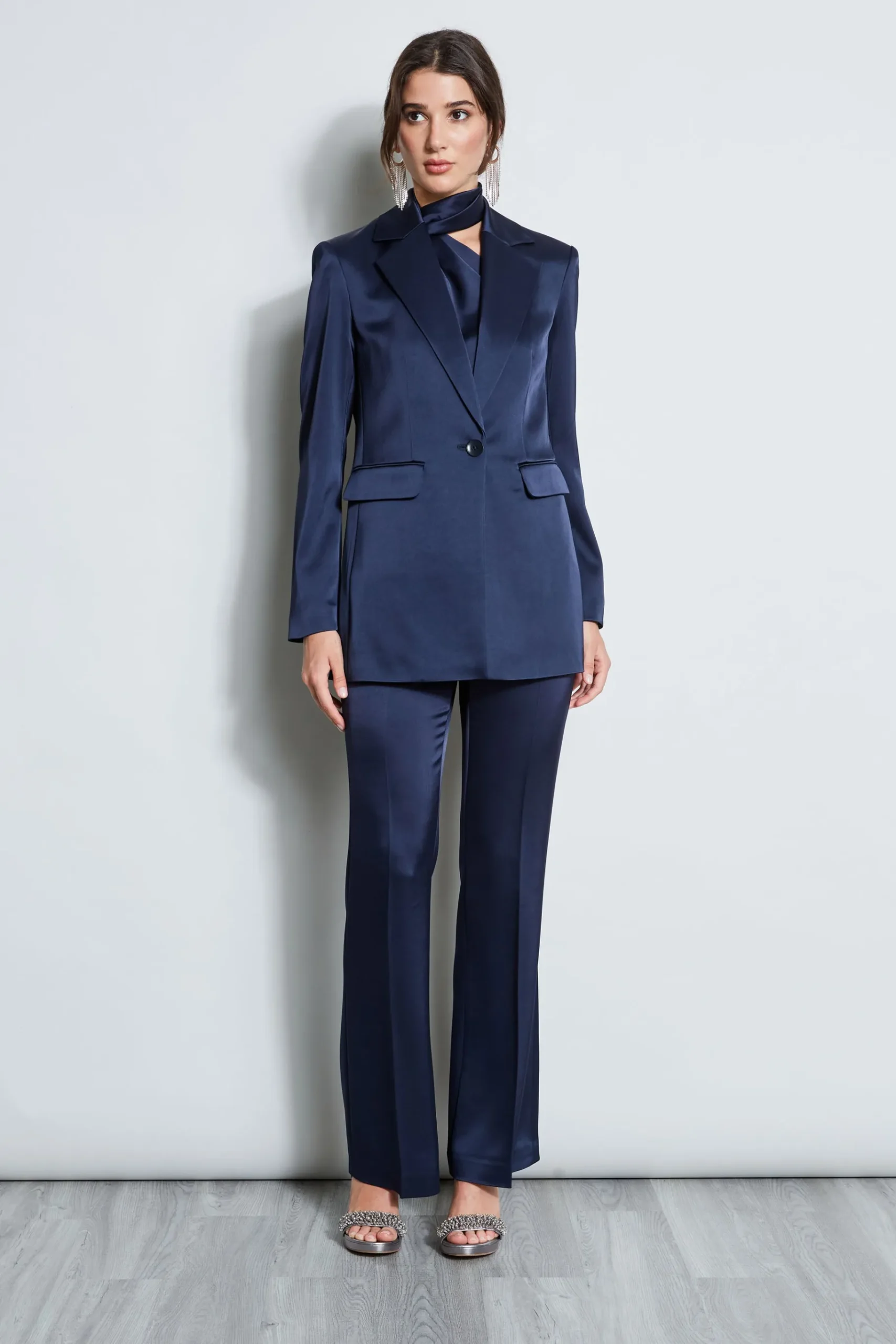 Indulge in the art of modern chic with our Luxe Satin Blazer. The unique patina and luxe touch of our Satin Blazer gives a femme twist to its relaxed silhouette. It’s a wardrobe essential that effortlessly elevates any outfit. Dress it up with its matching pant u0026amp; scarf top for a chic look or pair it with your favorite jeans for a cool casual vibe. Versatility meets luxury, making this blazer a true must-have. Elie Tahari Exclusive Single-Button Oversized Boyfriend Satin Blazer 80% Acetate, 20% Polyester Hits Below Hip; Runs true to size. Model is 5’9″ and wearing size 2 Length From Shoulder to Hem: Back 29″L, Sleeve 32.5″L (approx. length for size 6) Dry Clean Only Imported Style #: E902C103