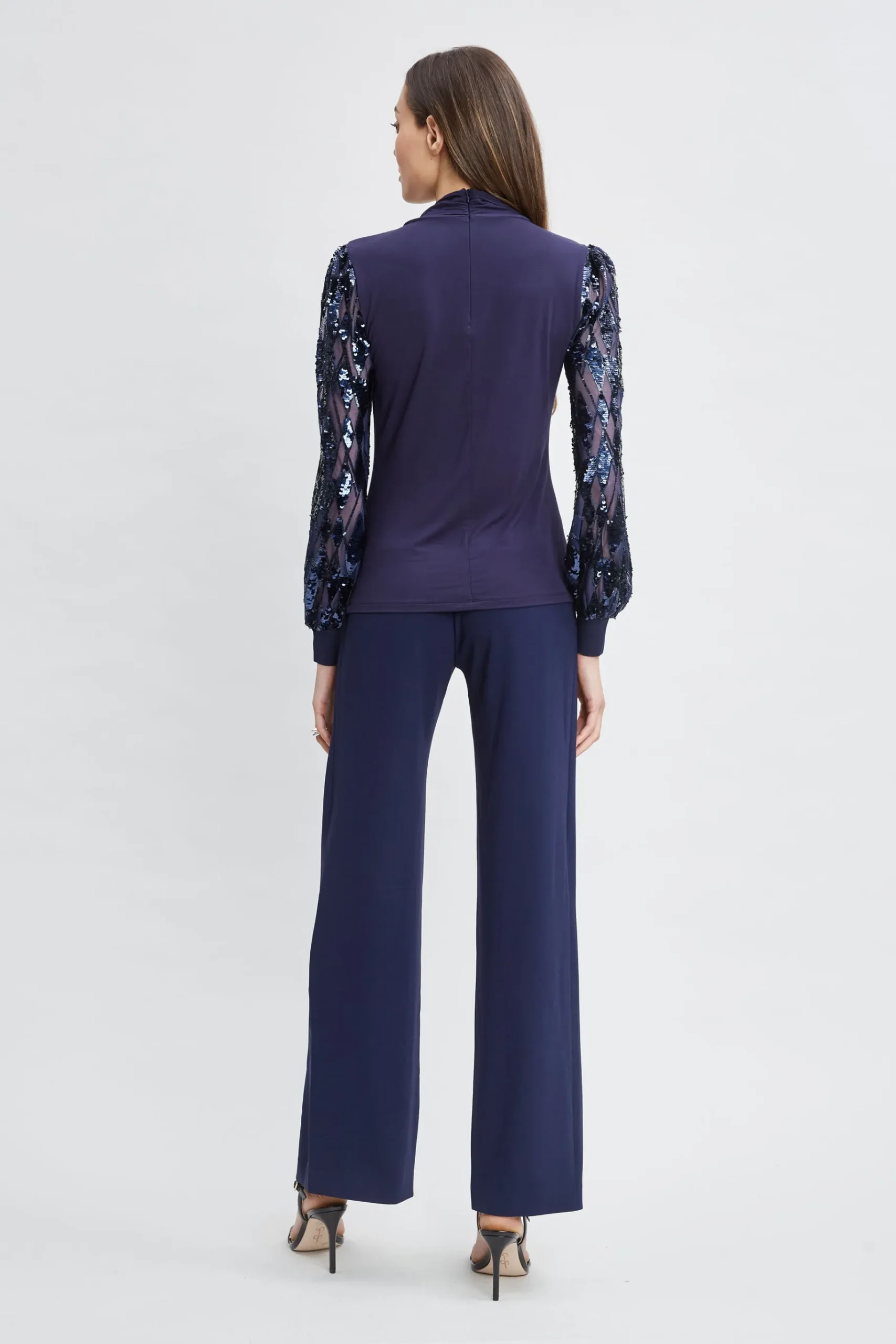 Modern and edgy, the twisted draped mock neck of our best-selling modal jersey knit top creates cool soft draped lines mixed with romantic sequin mesh sleeves. Elie Tahari Exclusive Twisted Mock Neck Knit with Sequin Sleeves 95% Modal, 5% Elastane Runs true to size. Model is 5’9″ and wearing size S Length From Shoulder to Hem: Back 23.75″L, Sleeve: 25.5″L (approx. length for size S) Dry clean Imported Style #: ER06X504