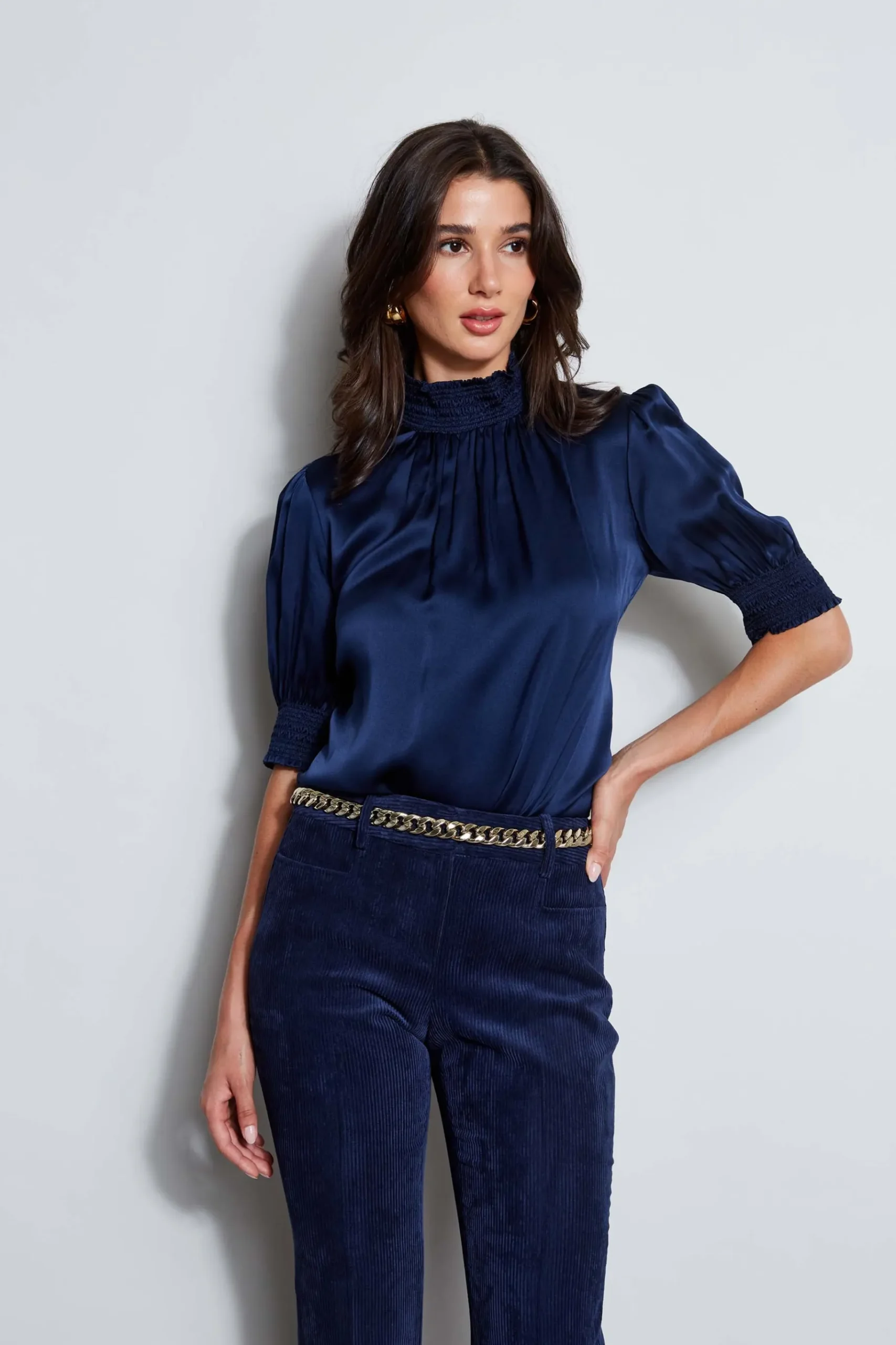 Elie Tahari Short Sleeve Silk Satin Smocked Shirt- Tops & Sweaters|Suiting