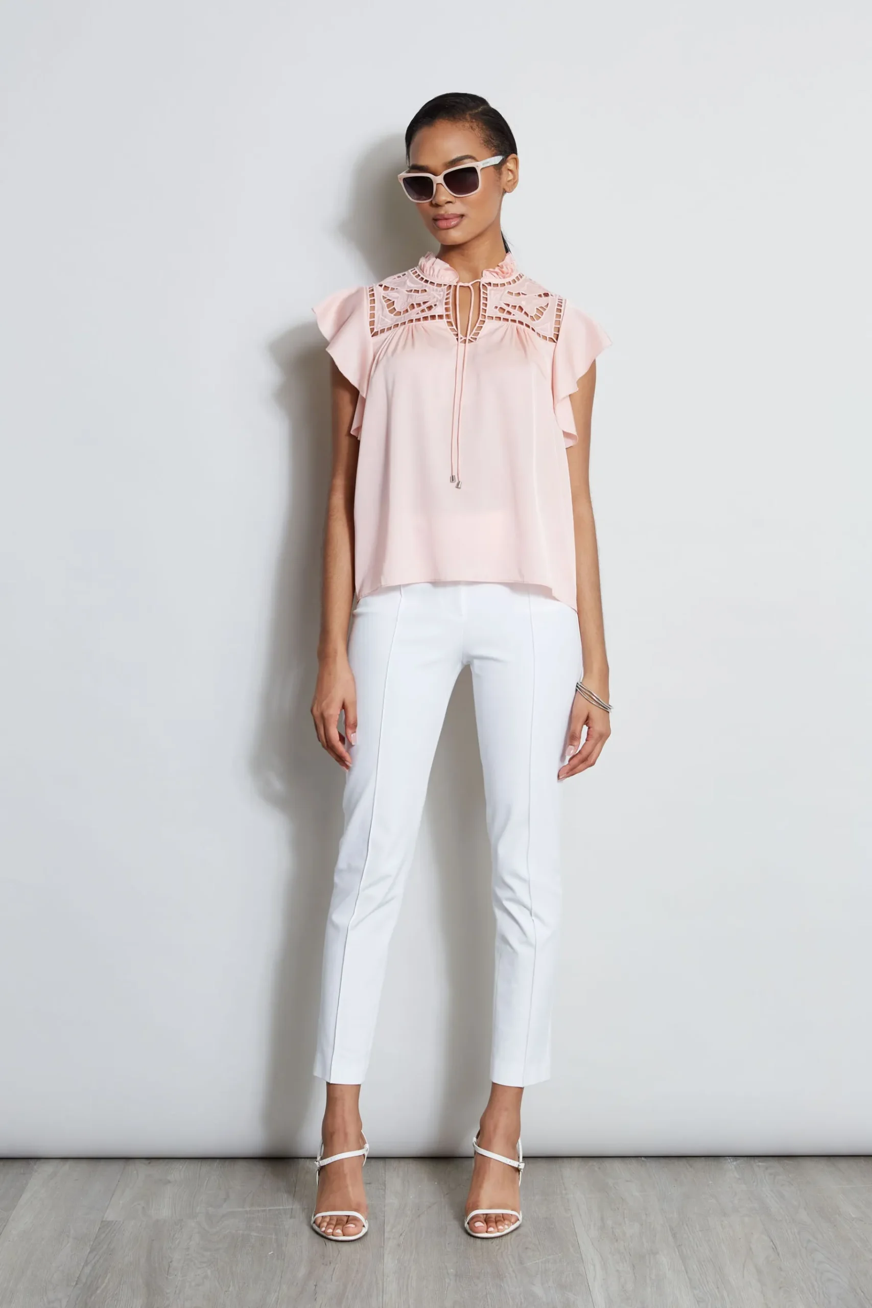 Made in our favorite Silk blend, our Embroidered Flutter Sleeve Shirt isn’t your basic top – delicate openwork embroidery detailing the bodice yoke, while the soft flutter sleeves lend a feminine twist to this must have Spring top. Silk Blend Shirt with openwork Embroidery u0026amp; Flutter Sleeves 91% Silk, 9% Elastance Runs true to Size Model is 5’9″ and wearing size S Measurements: 25″ from shoulder to hem (approx. measurements for size Small) Dry Clean Only Imported Style #: ETR41318