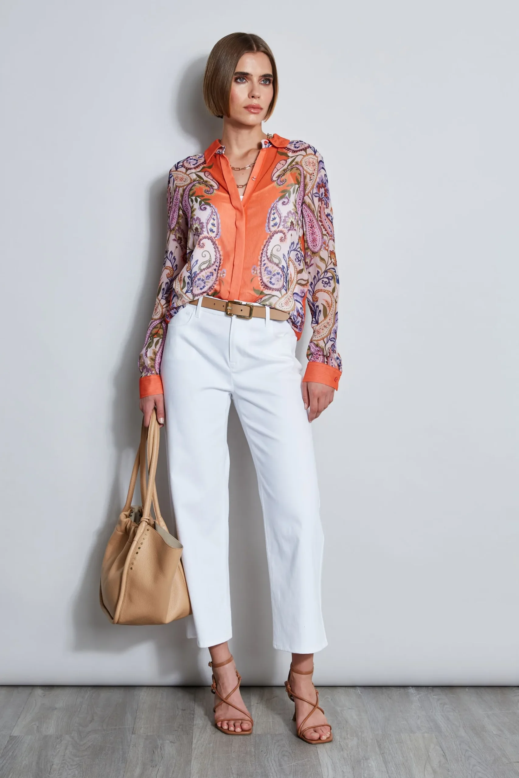 The unique scarf print of our Persian Paisley shirt makes it a collector’s piece. It is sophisticated mix of color and print make this button-down shirt both chic u0026amp; playful. Designed in Elie’s favorite Silk Crinkle Chiffon, it’s perfect for pairing with white or our jeans. *Camisole Included Elie Tahari Exclusive Long Sleeve Persian Paisley Printed Crinkle Chiffon Button Down Shirt 100% Silk Runs true to Size Length From Shoulder to Hem: Sleeve 32.5″L, Back 27.5″L (approx. length for size S) Model is 5’9″ and wearing size XS Dry Clean Only Imported Style #: E7014504