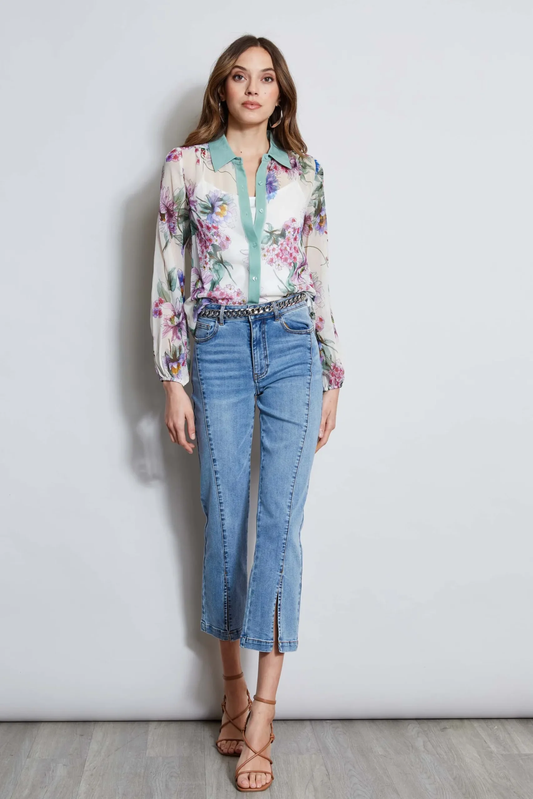 Breathe a little romance into your look with our Silk Crinkle Chiffon Shirt. With full blouson sleeves, this button-down top lends a femme twist to our exclusive Wind Floral print. It’s perfect for day into date nights and comes with a separate layering cami. Elie Tahari Exclusive Long Sleeve Floral Printed Silk Chiffon Button Down Shirt with Blouson Sleeves 100% Silk Crinkle Chiffon Runs true to size. Model is 5’9″ and wearing size S Length From Shoulder to Hem: Sleeve 33.25″L, Back 26.5″L (approx. length for size S) Dry clean only Imported Style #: E504K504