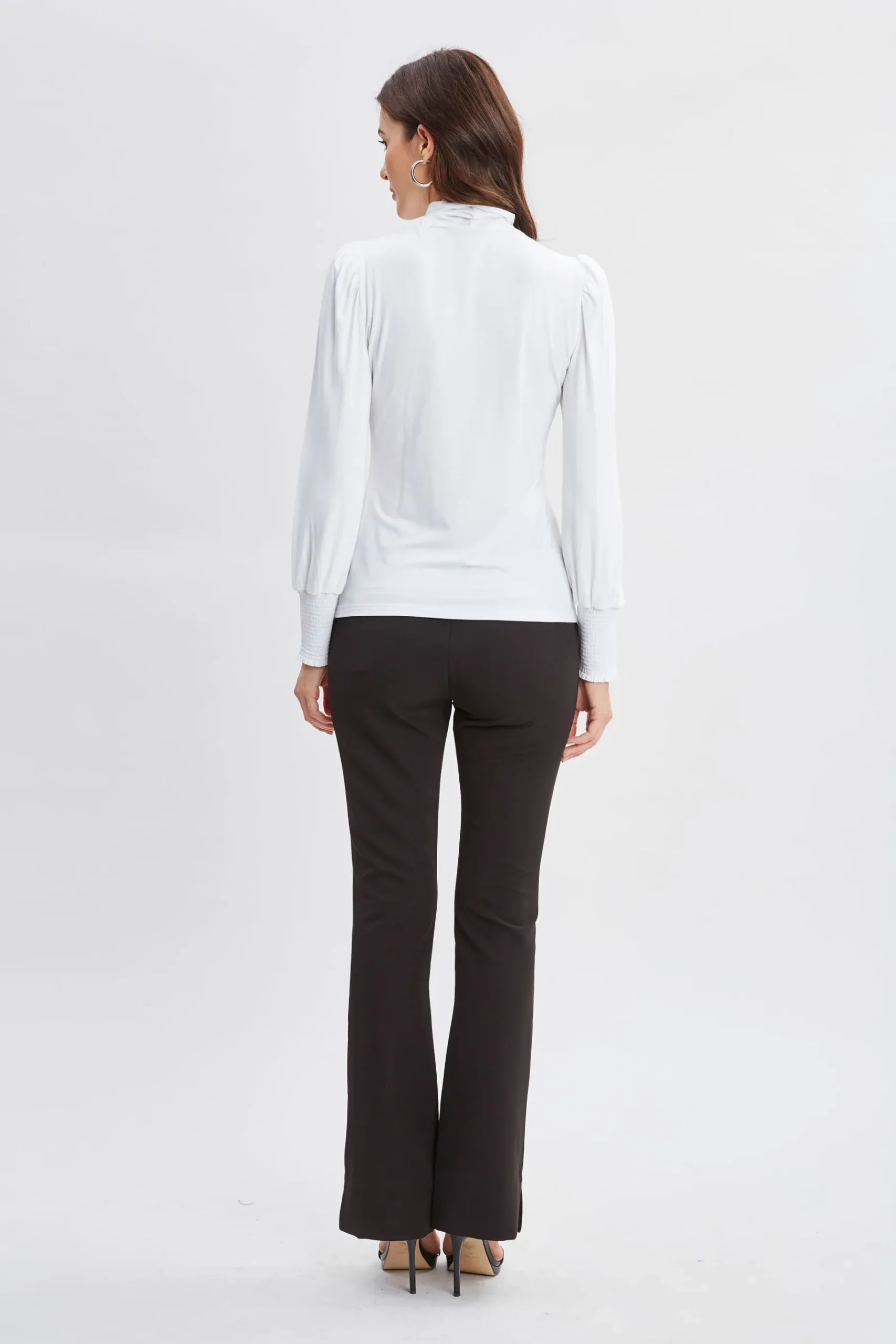 Refined and sophisticated, this Luxe Stretch Jersey Long Sleeve Turtle-Neck Knit features smocking at the cuff; lends a feminine twist to this essential Tee. Elie Tahari Exclusive Long Sleeve Smocked Cuff Turtleneck Knit 95% Modal, 5% Elastane Runs true to size. Model is 5’9″ and wearing size S Length From Shoulder to Hem: Sleeve 25.25″L, Back 23.5″L (approx. length for size S) Dry Clean Only Imported Style #: EN56X514
