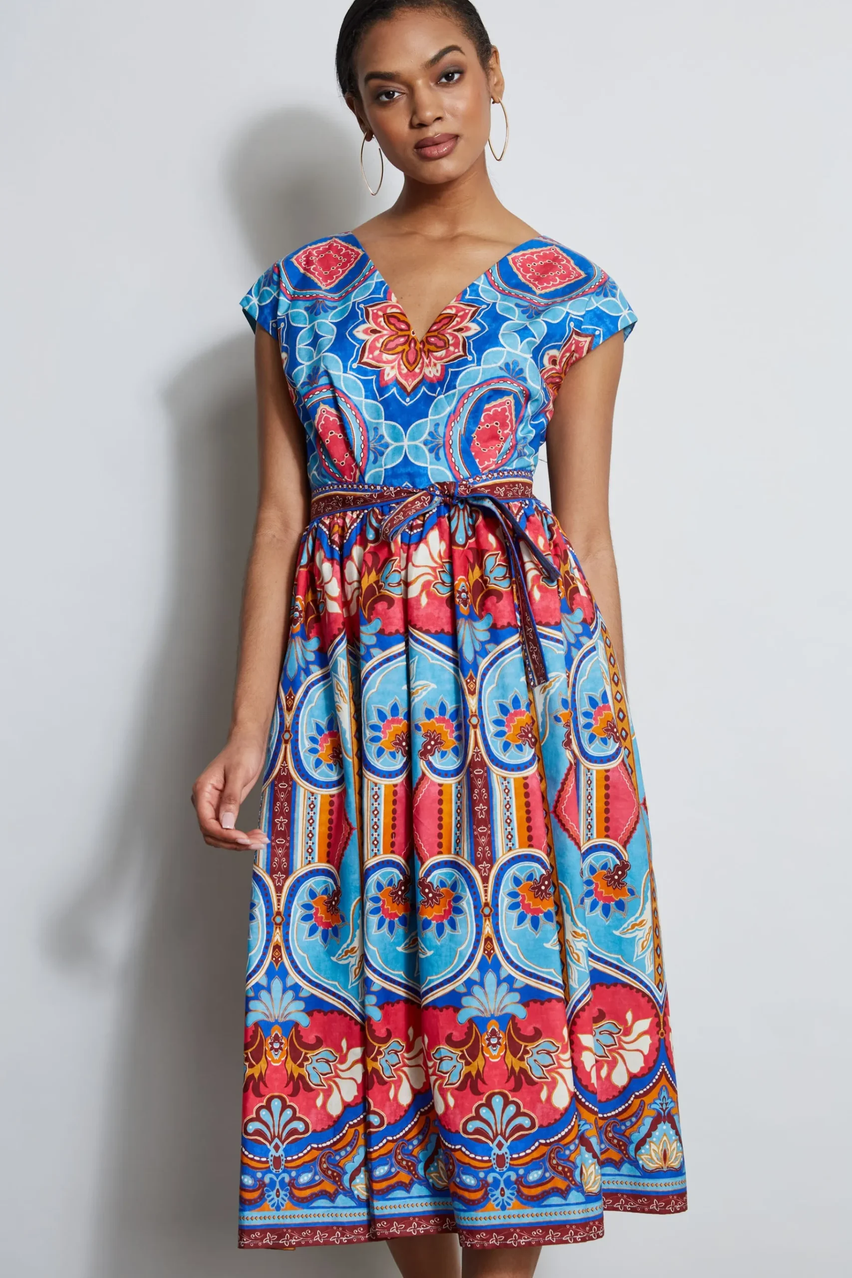 You will love our Tapestry Floral printed cotton midi dress. With its v-neckline, self-belt u0026amp; pleats that begin at the waist u0026amp; extend to the hem, this dress is a standout. Engineered Printed Cotton Midi Dress with Self Sash u0026amp; Full Skirt 100% Cotton Runs true to Size Model is 5’9″ and wearing size 4 Dry Clean Only Imported Style #: ETR41339