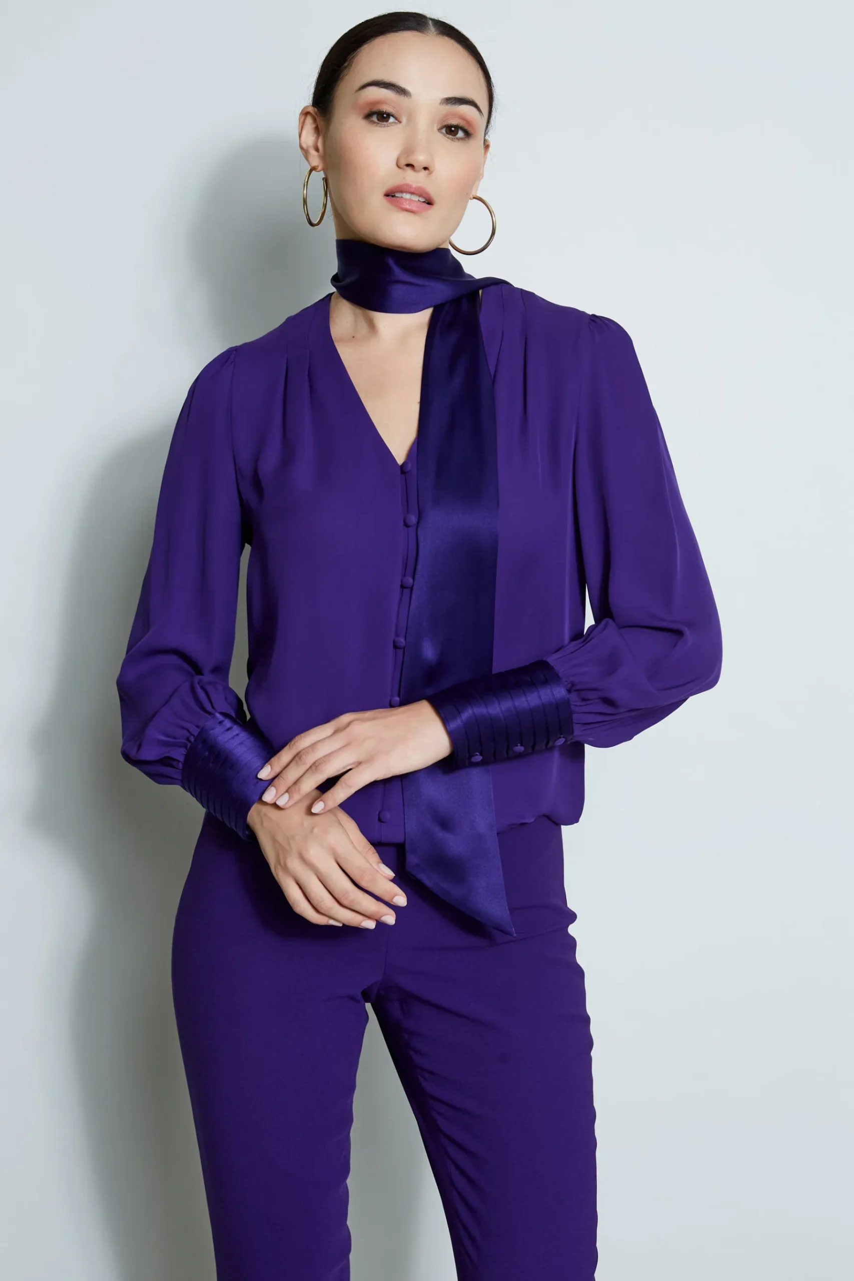 Elegantly feminine in Silk Georgette, our blouson shirt is accented with a removable Silk Satin Tie and dramatic pleated cuffs. Elie Tahari Exclusive Silk Georgette Long Sleeve Button Front V-Neck Shirt with pleated cuffs u0026amp; Satin Neck Tie. 100% Silk Relaxed Fit; Runs true to size. Model is 5’9″ and wearing size S Length From Shoulder to Hem: Back 27″L; Sleeve 25″L (approx. length for size S) Dry clean Imported Style #: ER10N523