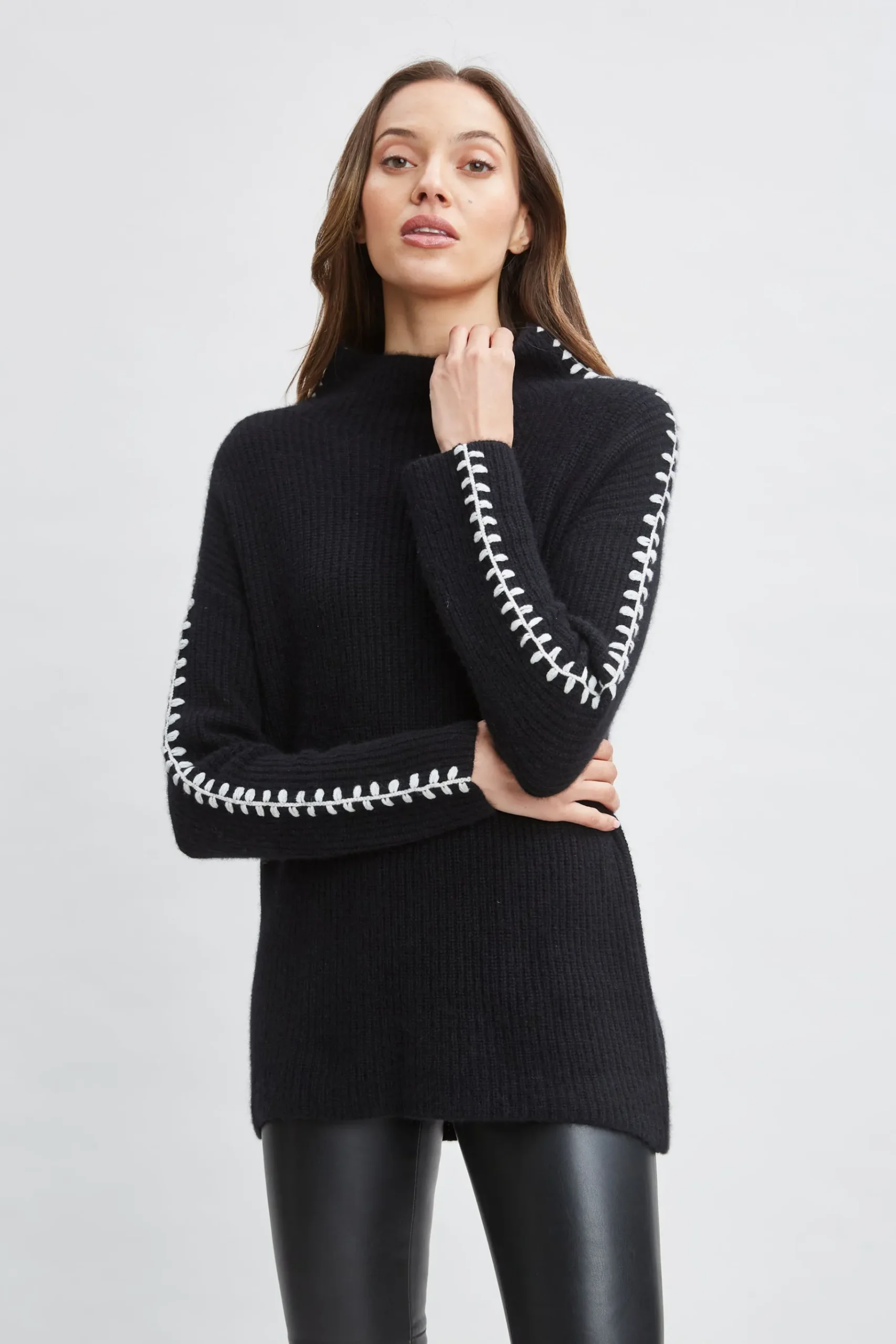 Graphic whip stitching from the funnel neck to the cuff details our relaxed fit sweater. Perfect for when the temperature drops, you will love the soft hand feel of this ultra-soft Cashmere yarn. Long Sleeve Cashmere Sweater with a Relaxed Fit u0026amp; Stitching Detail 100% Cashmere Runs true to size Model is 5’9″ and wearing size S Dry Clean Only Imported Style #: ETR34198