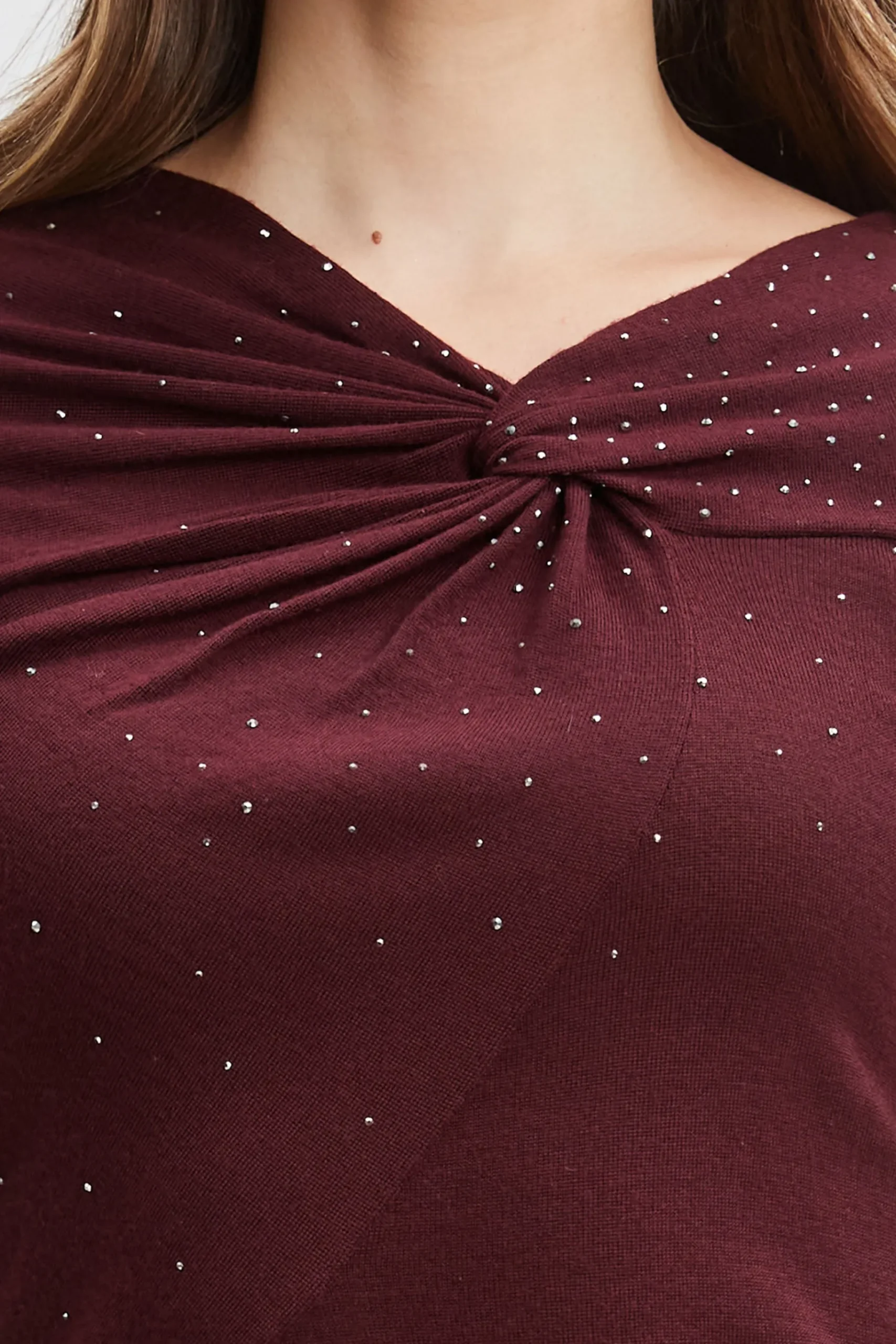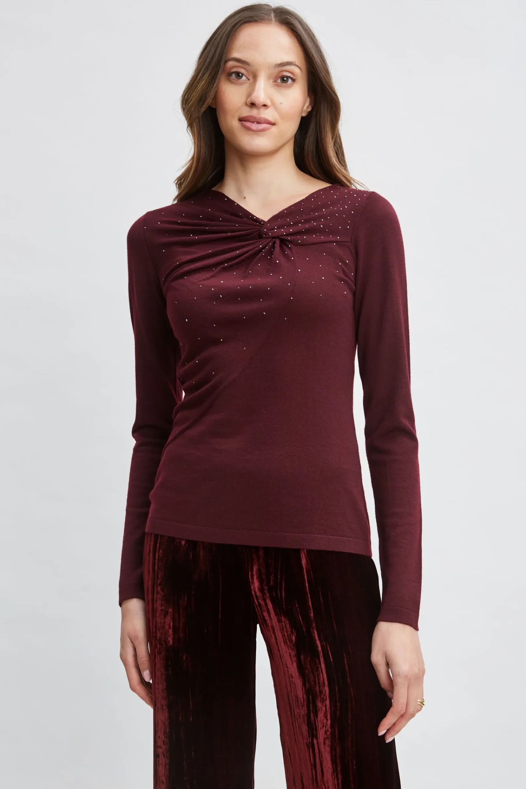 The twist front asymmetric neckline lends an artistic edge to this merino wool sweater while the heat transfer crystals add a touch of shimmer. We’re obsessed with it paired with velvet or denim. Elie Tahari Exclusive Twist Neck Knot Sweater with Heat Transfer Crystals 100% Merino Wool Runs true to size. Model is 5’9″ and wearing size S Length From Shoulder to Hem: Back 24″L, Sleeve 24.5″L (approx. length for size S) Dry Clean Only Imported Style #: ER0X5544