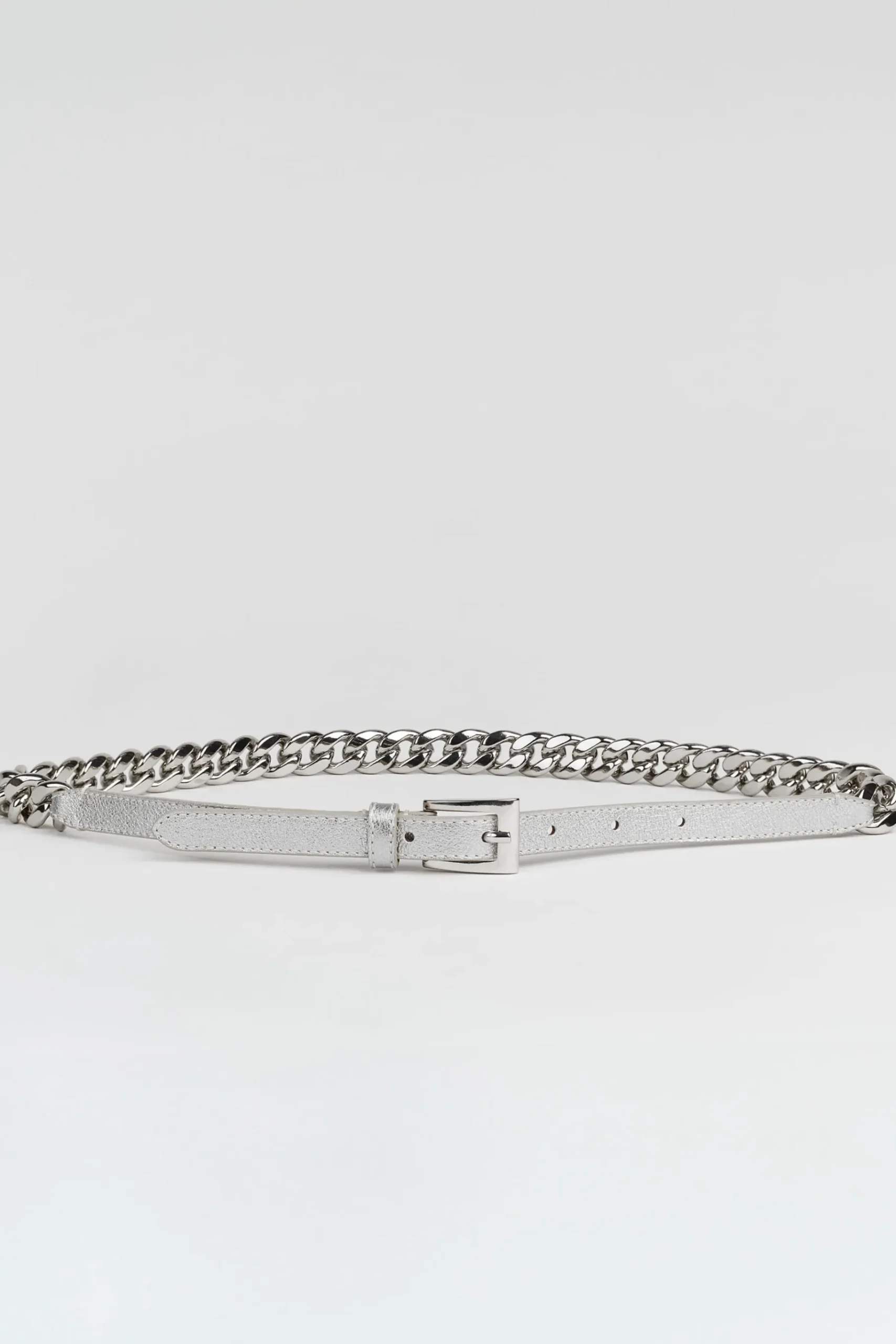 The “IT” accessory for Spring. Add an effortless glam factor to any look with our Silver Chain link belt. We love it worn with a suit or dress – style meets function with the must-have belt of the season. Wear it buckled in the back for an all chain look, or wear it buckled in the front highlighting its modern leather tab closure and silver buckle. Brass Chain Metallic Leather Belt 100% Leather, Silver Made in Italy A815G003