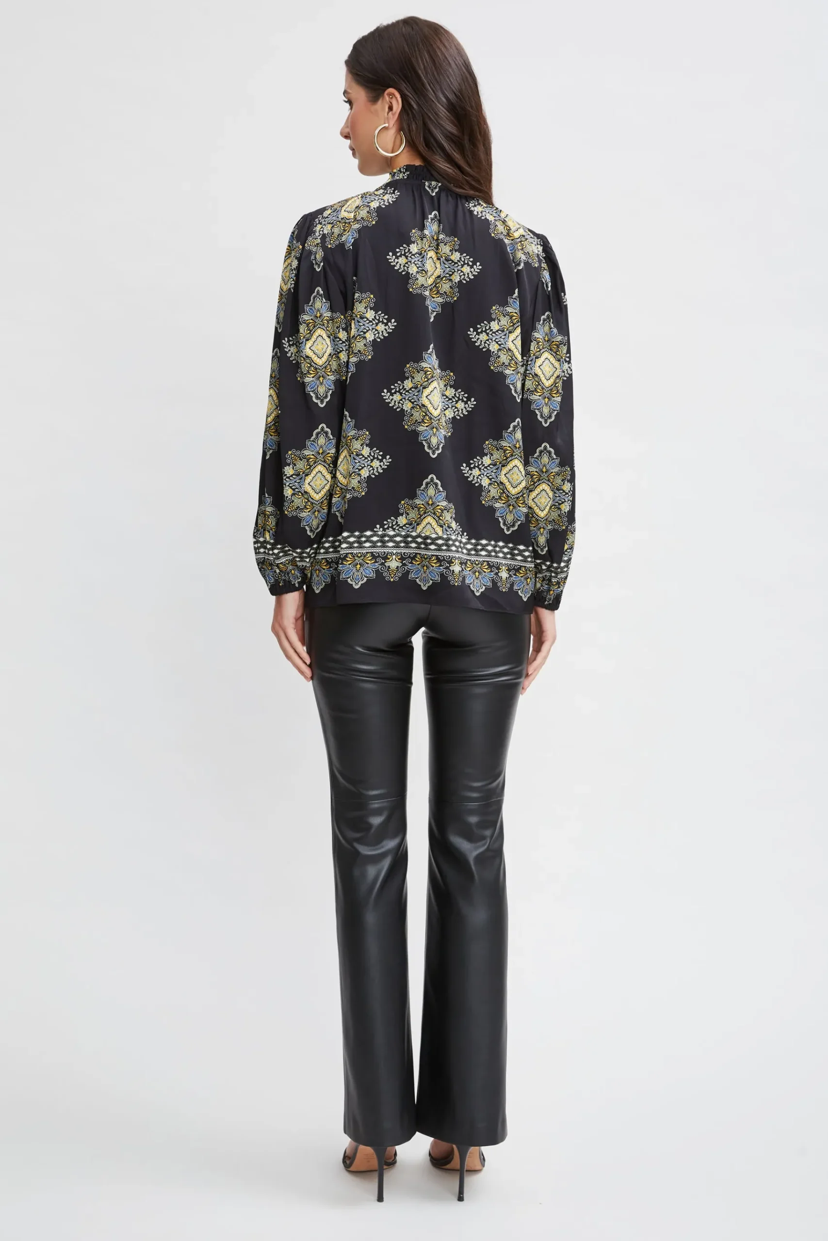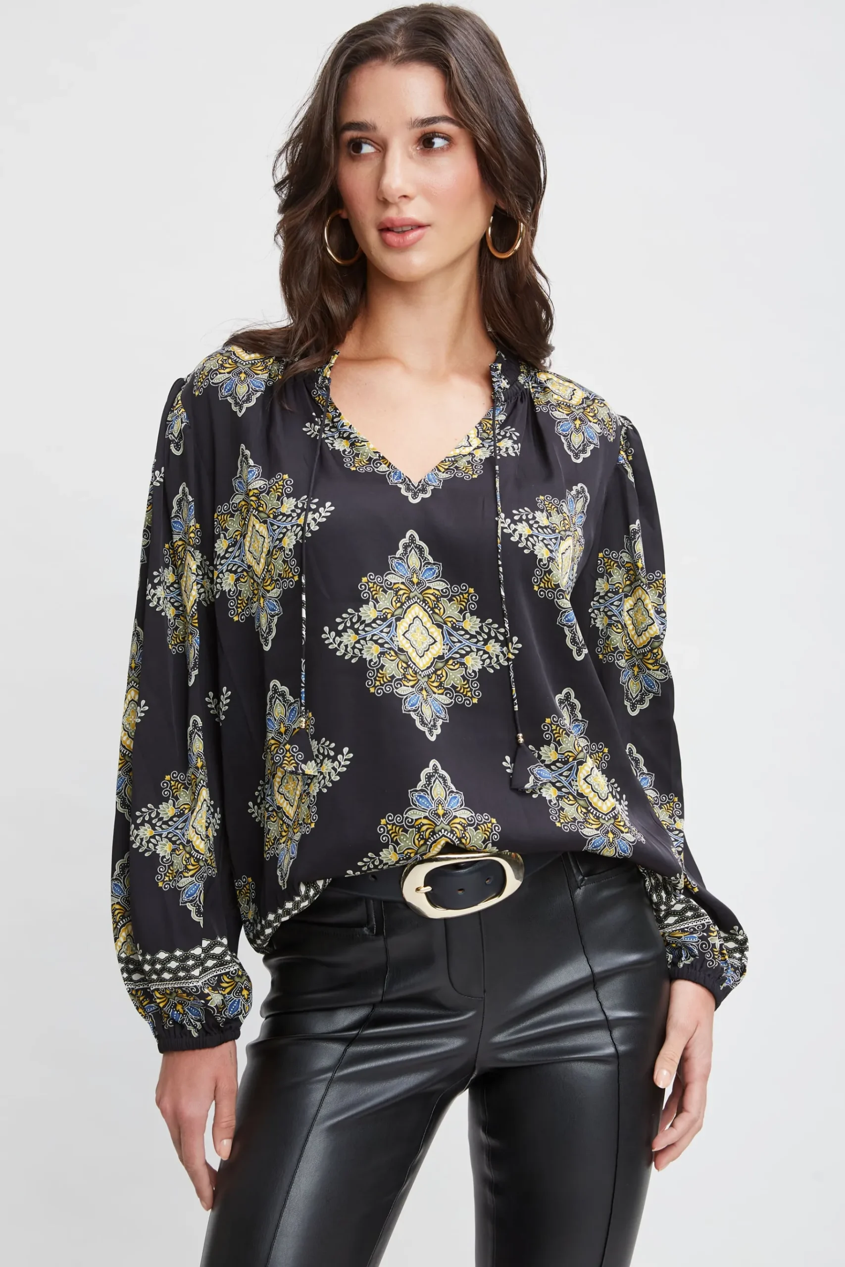 A chic necktie and bold shoulders lend a sophisticated twist to this season’s must have shirt. Crafted in luxe silk, our geometric Marseille Print is effortless u0026amp; ultra-cool. Pair it with our vegan leather pants or crepe for the perfect Fall look. Geometric Print Shirt with Neck Tie 91% Silk, 9% Spandex Runs true to Size Model is 5’9″ and wearing size S Dry Clean Only Imported Style #: ETR44238