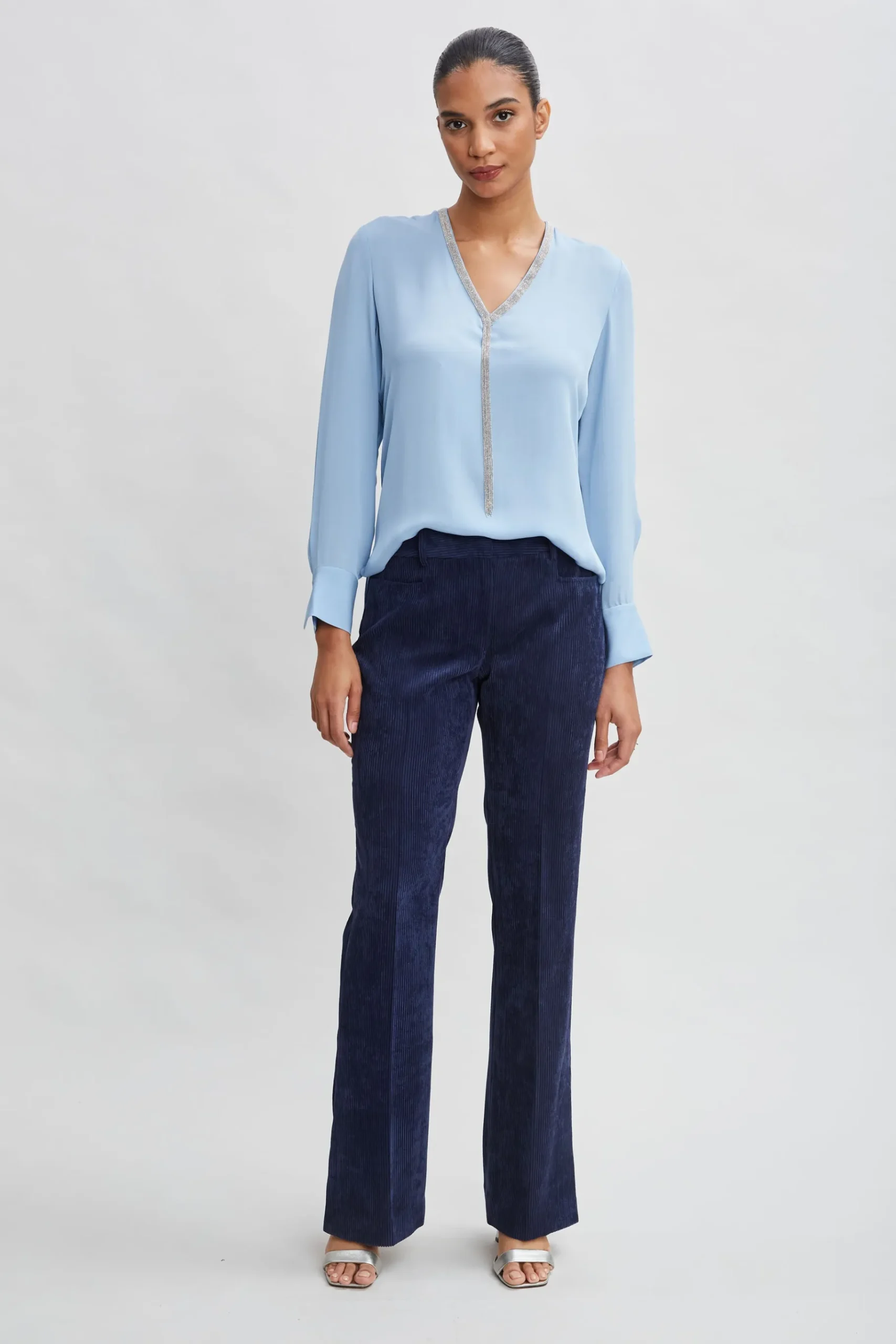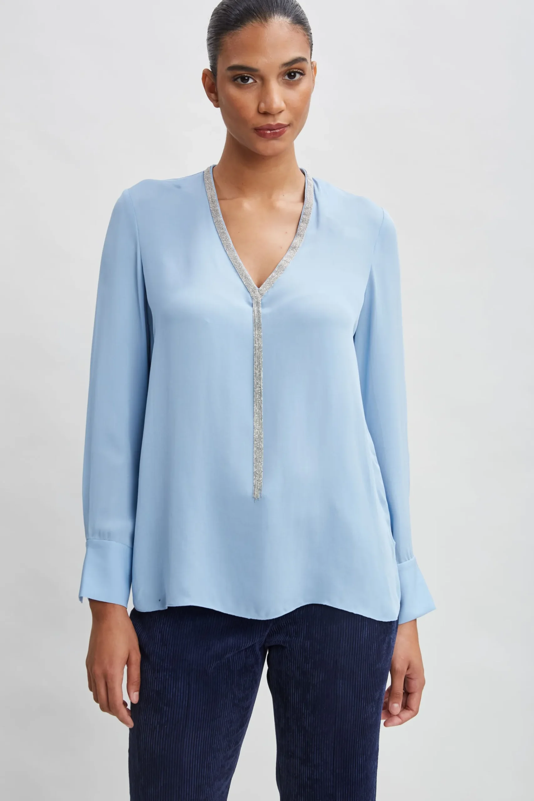 Monili Chain lends our Silk Georgette shirt a modern chic attitude. The flattering V-neck is detailed with chain trim and a delicate fringed chain. A modern staple that you’ll reach for again and again. Dress it up or down. Elie Tahari Exclusive Long Sleeve Chain Shirt 100% Silk Runs true to Size Length From Shoulder to Hem: Back 26.5″L, Sleeve: 32.5″L (approx. length for size S) Model is 5’9″ and wearing size XS Dry Clean Only Imported Style #: E910N504