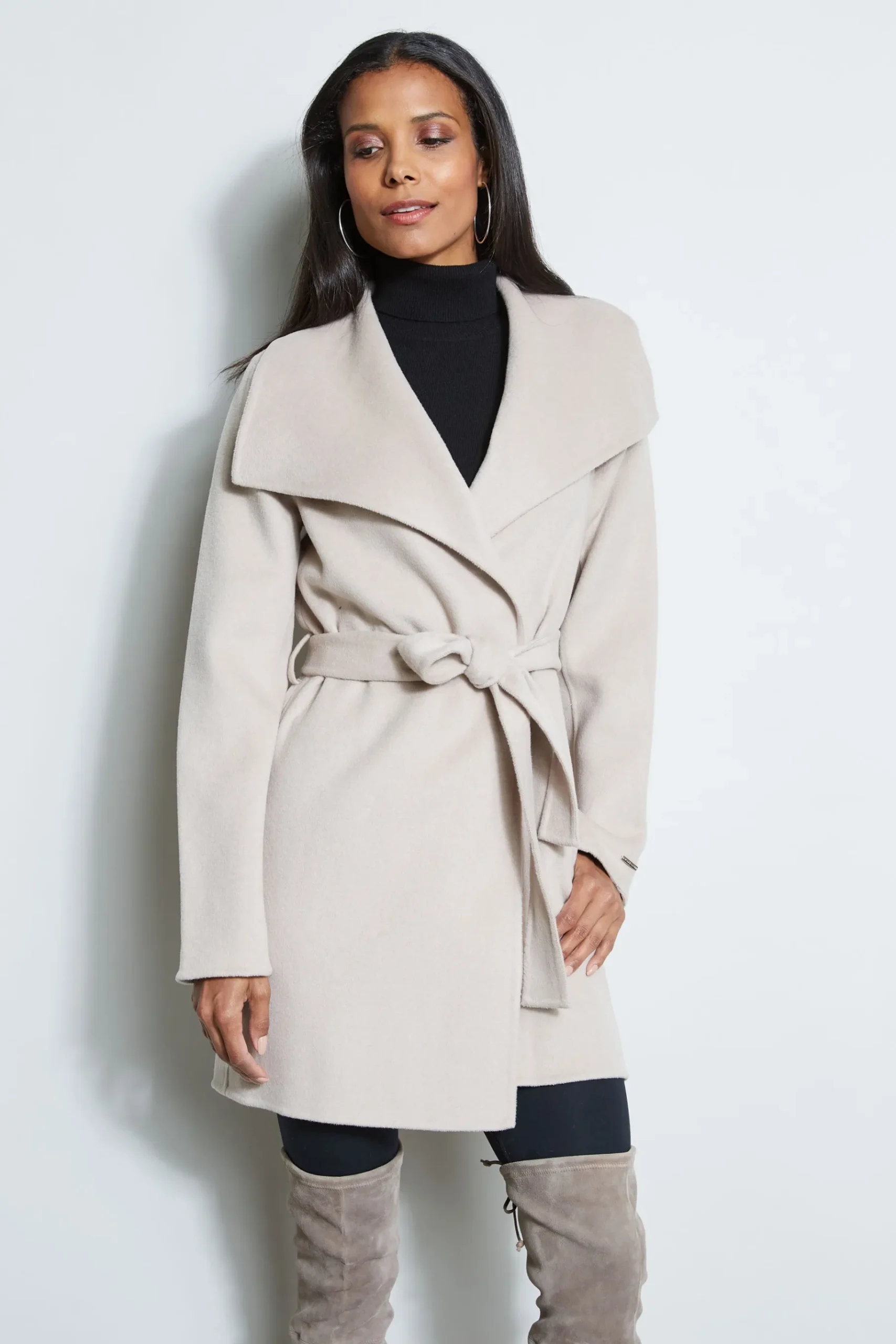 Layer up in our cozy chic Tahari wrap coat. Our Double Face Wool blend transitional piece features a dramatic lapel, self sash, side seam pockets u0026amp; a mid-length silhouette. You will wear this all season long. Layer it over everything from chic dresses to Fall’s must have Cashmere sweaters. Tahari Double Face Lightweight Wool Blend Wrap Coat 64% Wool, 30% Polyester, 3% Nylon, 3% Acrylic; Unlined Runs true to Size Model is 5’9″ and wearing size S Dry Clean Only Imported Style# 6620635
