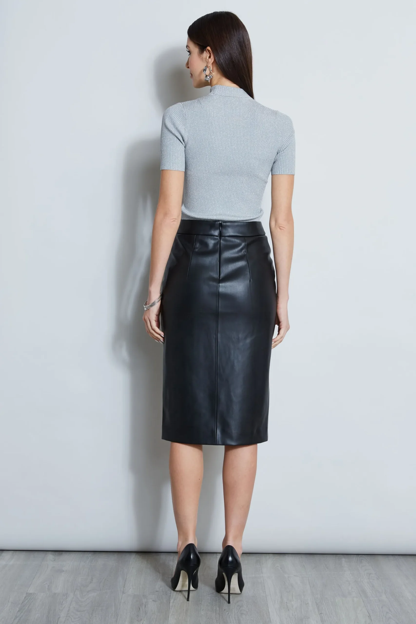 Elie loves the cool factor of our Vegan Leather Pencil Skirt. Crafted in soft-touch vegan leather, it features an ultra-flattering faux wrap silhouette and graphic buckle detail. Decidedly chic, pair it with our knits and your favorite kitten heel or booties. Elie Tahari Exclusive Vegan Leather Faux Wrap Skirt that hits above the Knee 50% Polyester, 50% Polyurethane Runs true to size. Model is 5’9″ and wearing size 2 Length from Waist to Hem: Back 28.25″L (approx. length for size 6) Imported Dry Clean Only Style #: E10AM303
