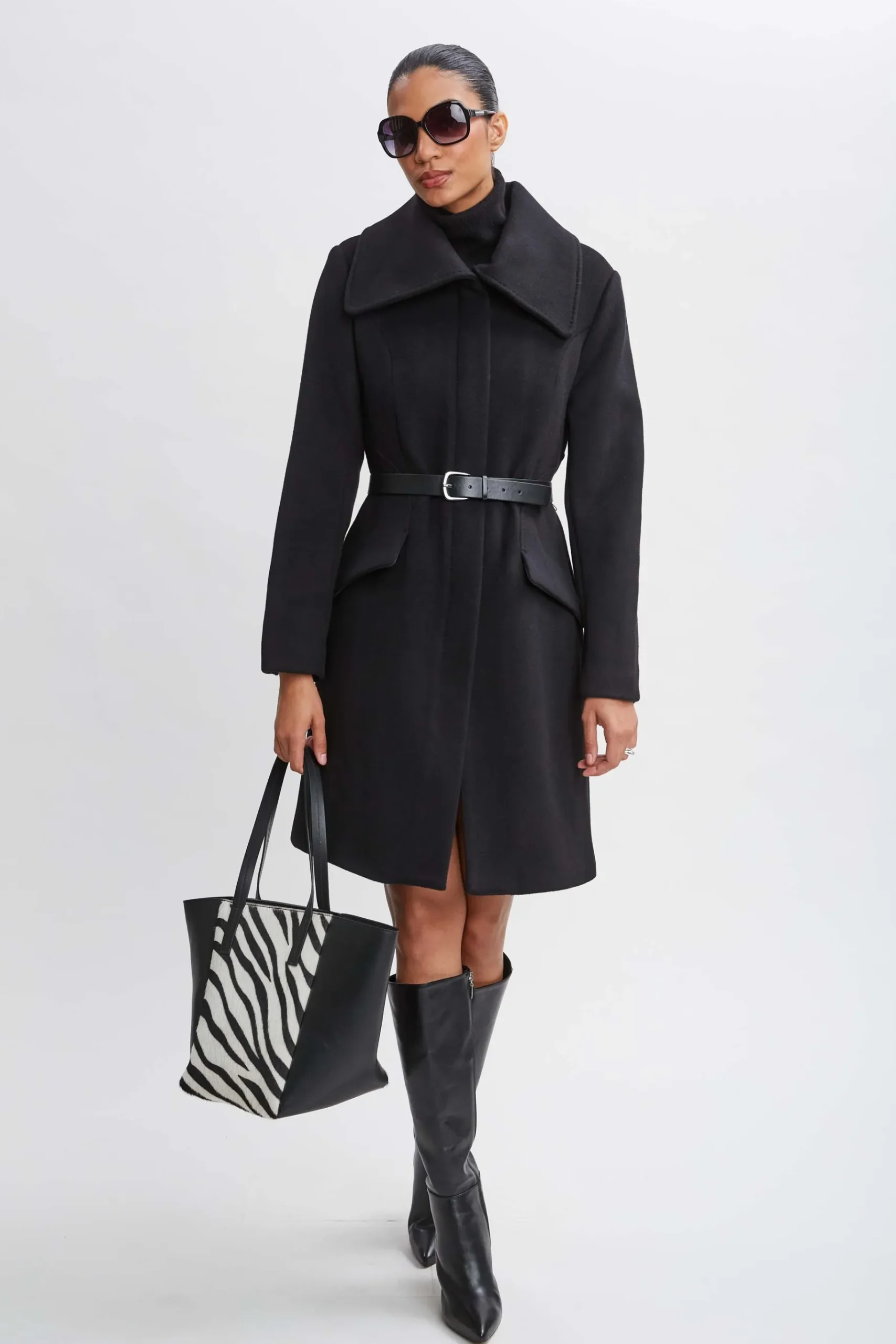 Wrap up this season in our chic belted coat done in a warm double face wool. This sophisticated fully lined coat makes a cold weather statement featuring an oversized collar, contour seams and vegan leather belt; the silhouette is a modern twist on a classic, setting a new standard in outerwear. Elie Tahari Exclusive Panel Wool Coat with Vegan Leather Belt u0026amp; oversized collar 80% Wool, 15% Nylon, 5% Cashmere Runs true to Size Length From Shoulder to Hem: Back 38.5″L, Sleeve: 33″L (approx. length for size S) Model is 5’9″ and wearing size XS Dry Clean Only Imported Style #: E9067404